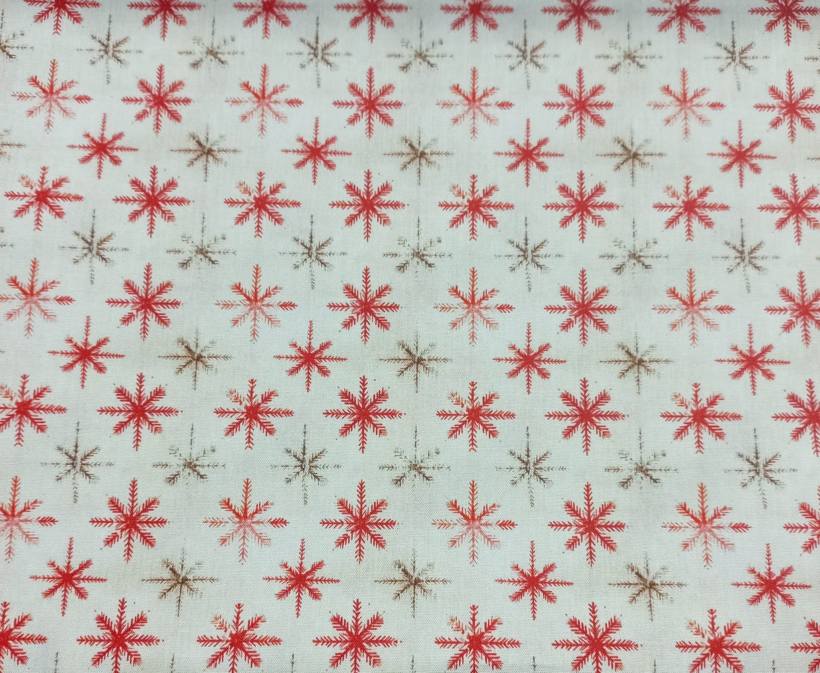 Tricoline 100% algodão com cristais de gelo em tons de vermelho em fundo pérola.