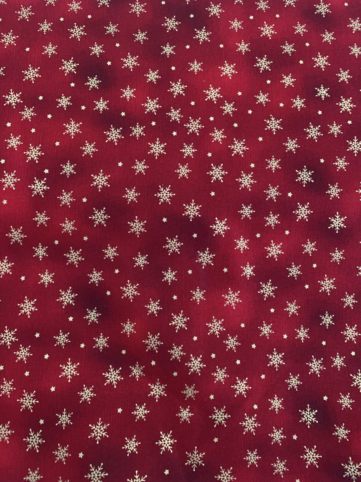 Popeline 100% algodão, com cristais de gelo dourados em fundo vermelho.