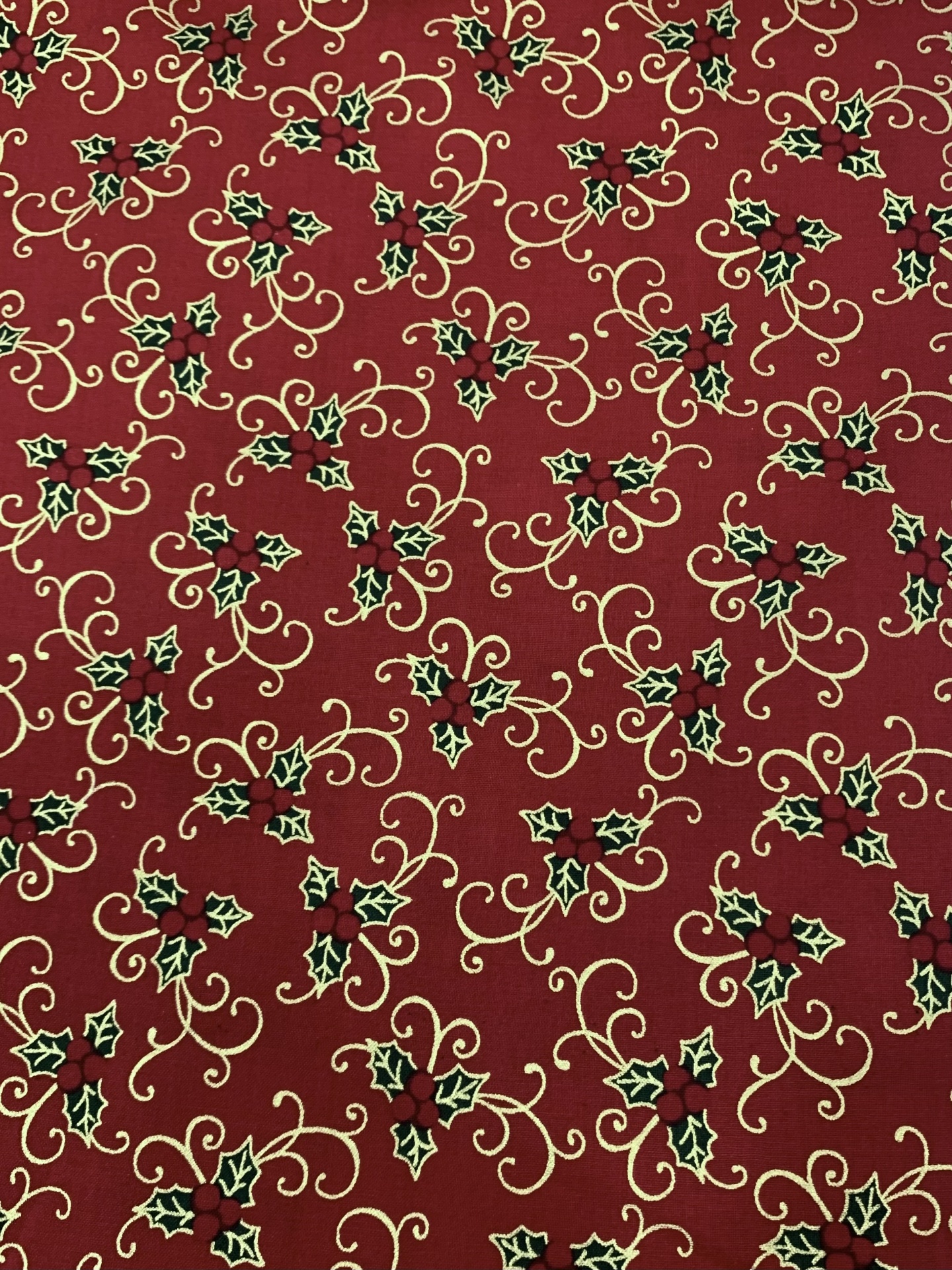 Popeline 100% algodão, com azevinho em fundo vermelho.