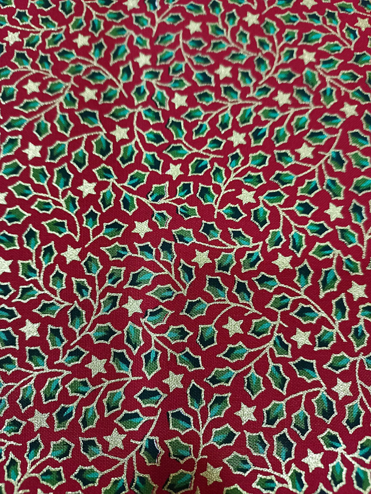 Popeline 100% algodão, com azevinho em fundo vermelho.