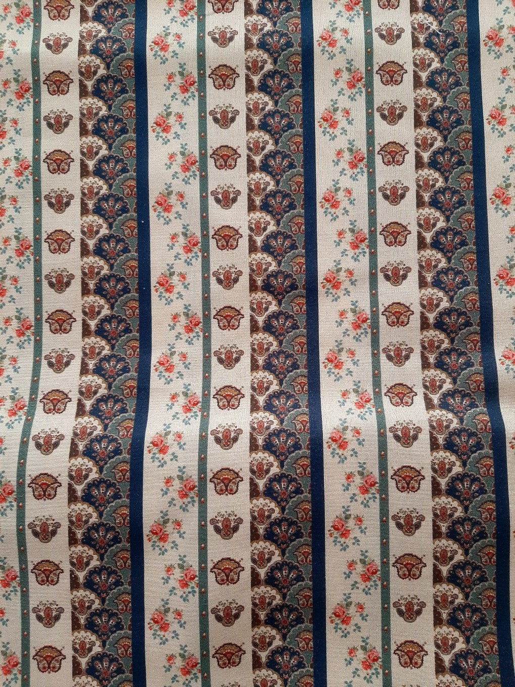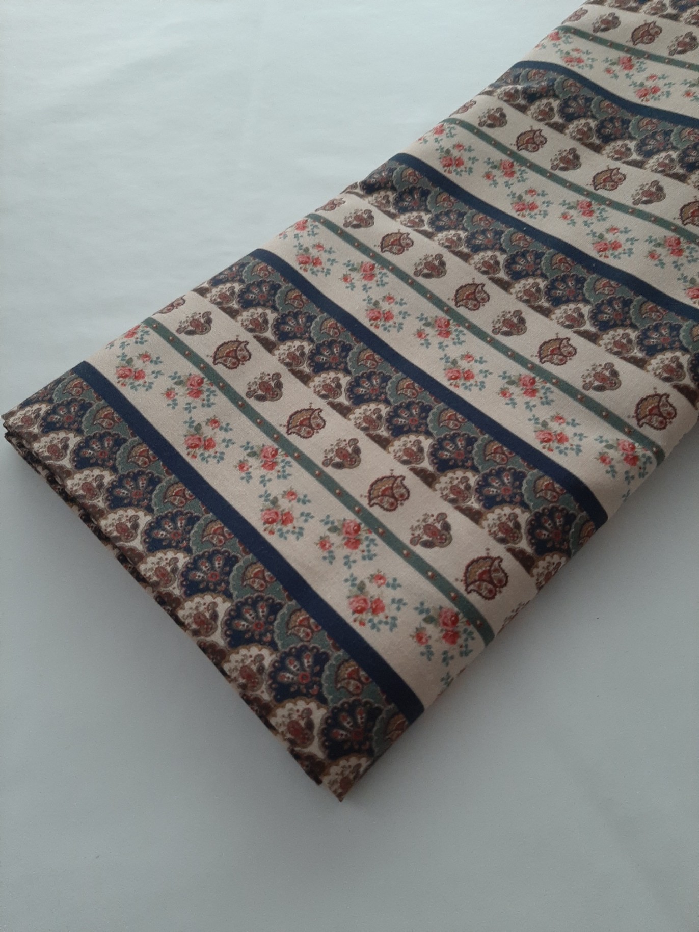 Tecido Stof Fabrics 100% algodão, em tons de creme e azul.