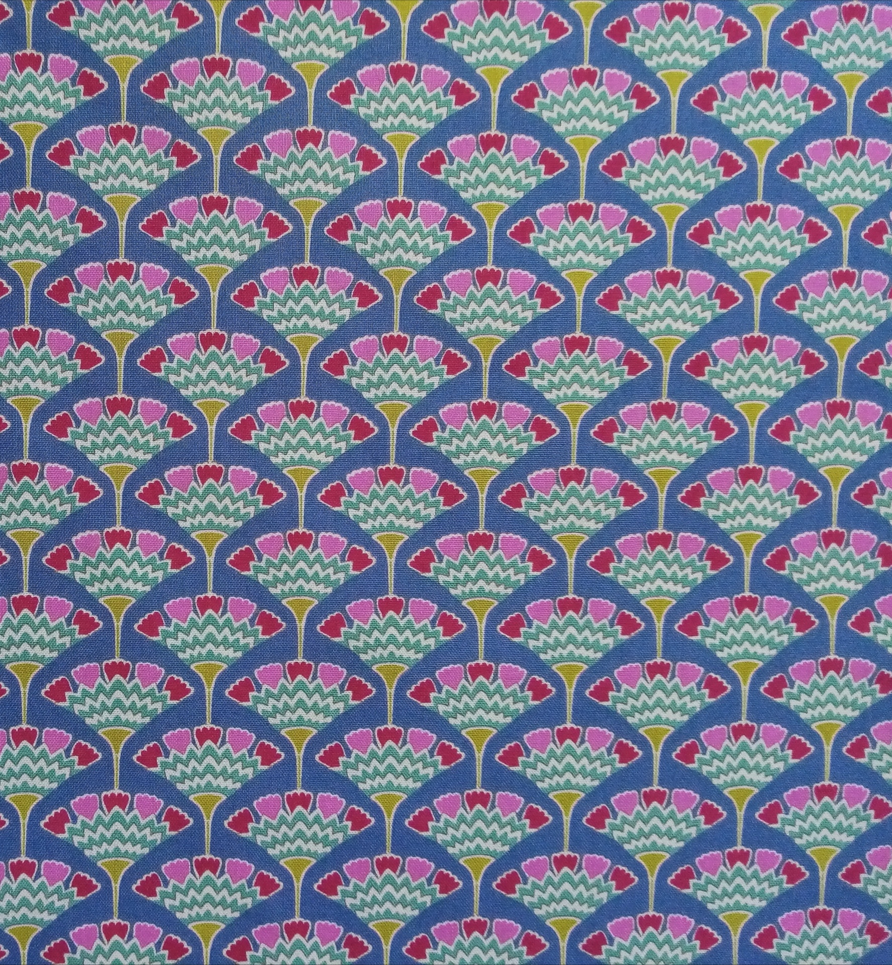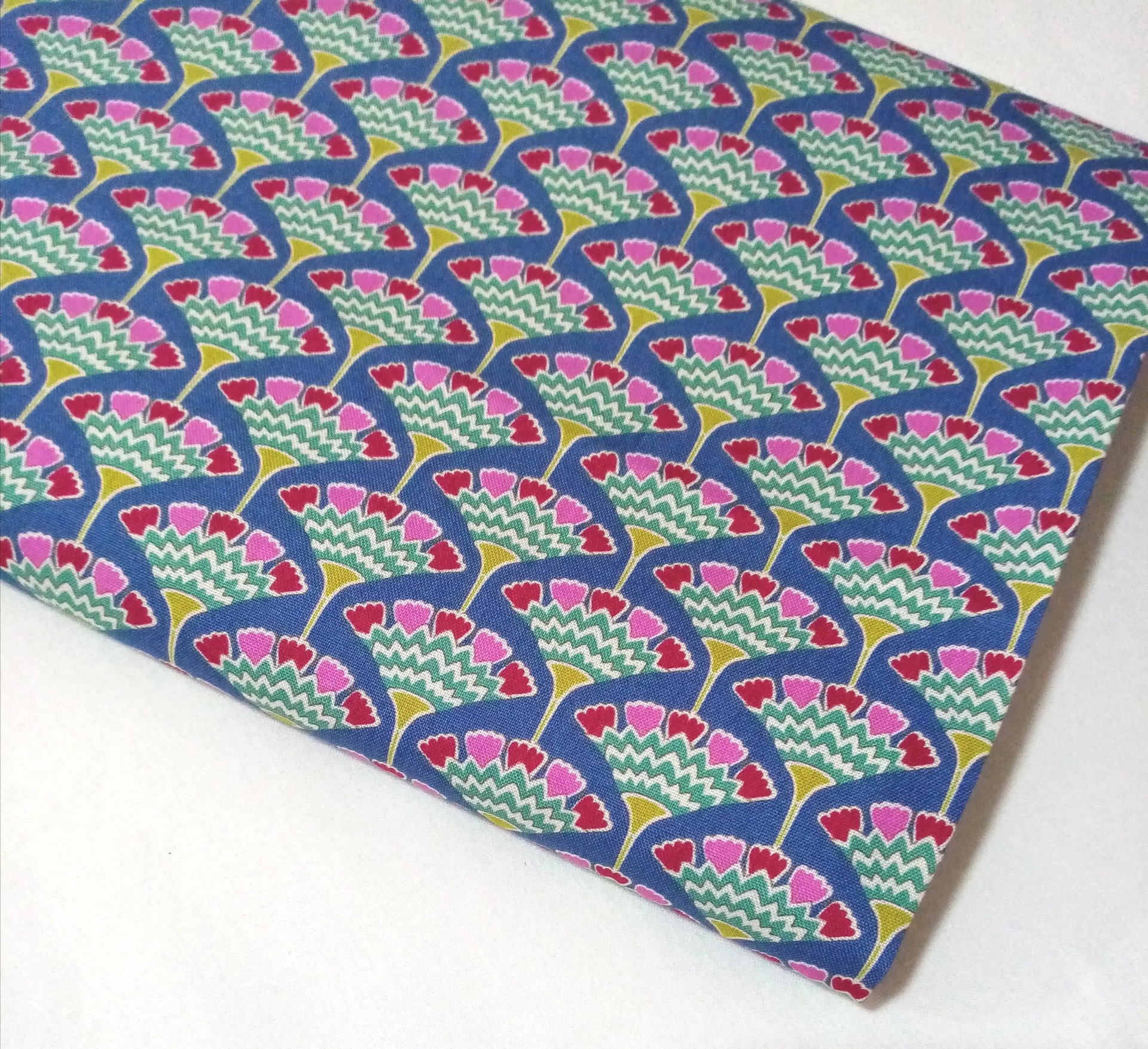 Tecido Tilda 100% algodão, com flores em tons de rosa e vermelho em fundo azul.