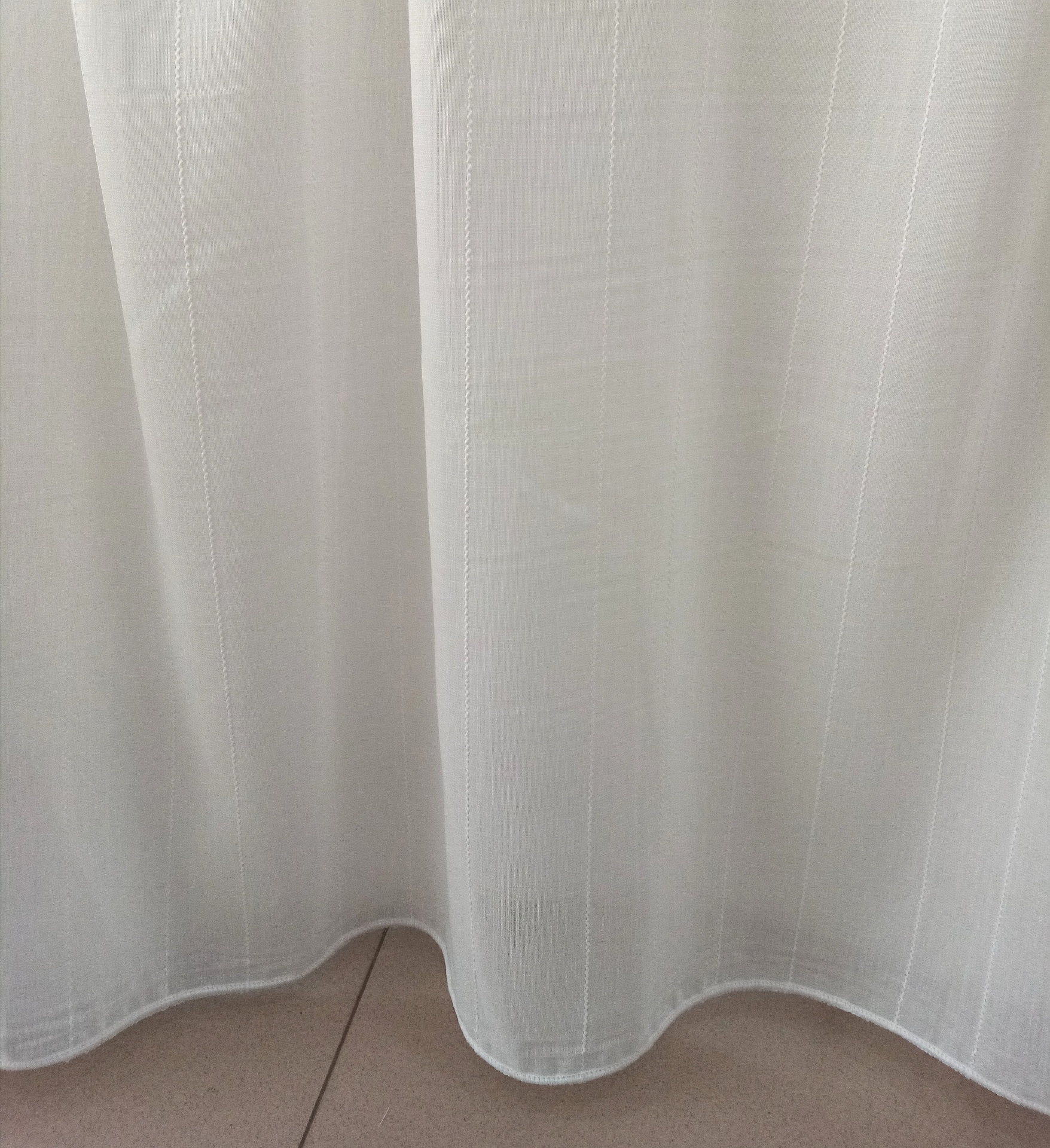 Com acabamento incorporado de fio de chumbo na bainha. Terminando assim o cortinado com uma boa caida.