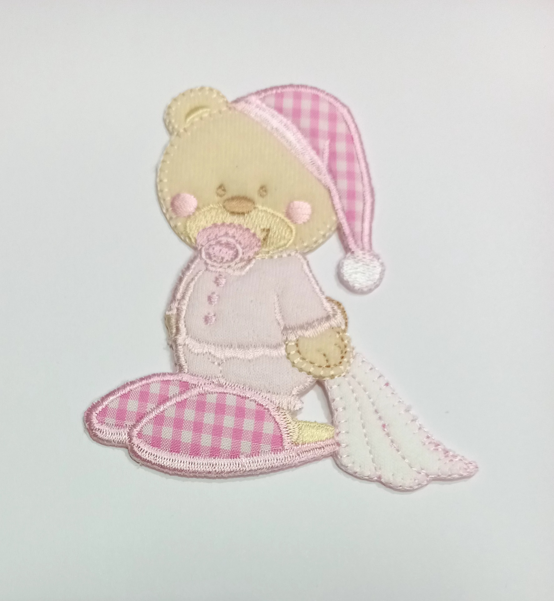 Aplicação termoadesiva com ursinho com chupeta rosa.
