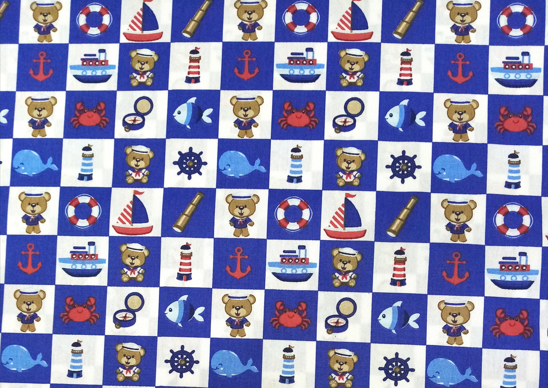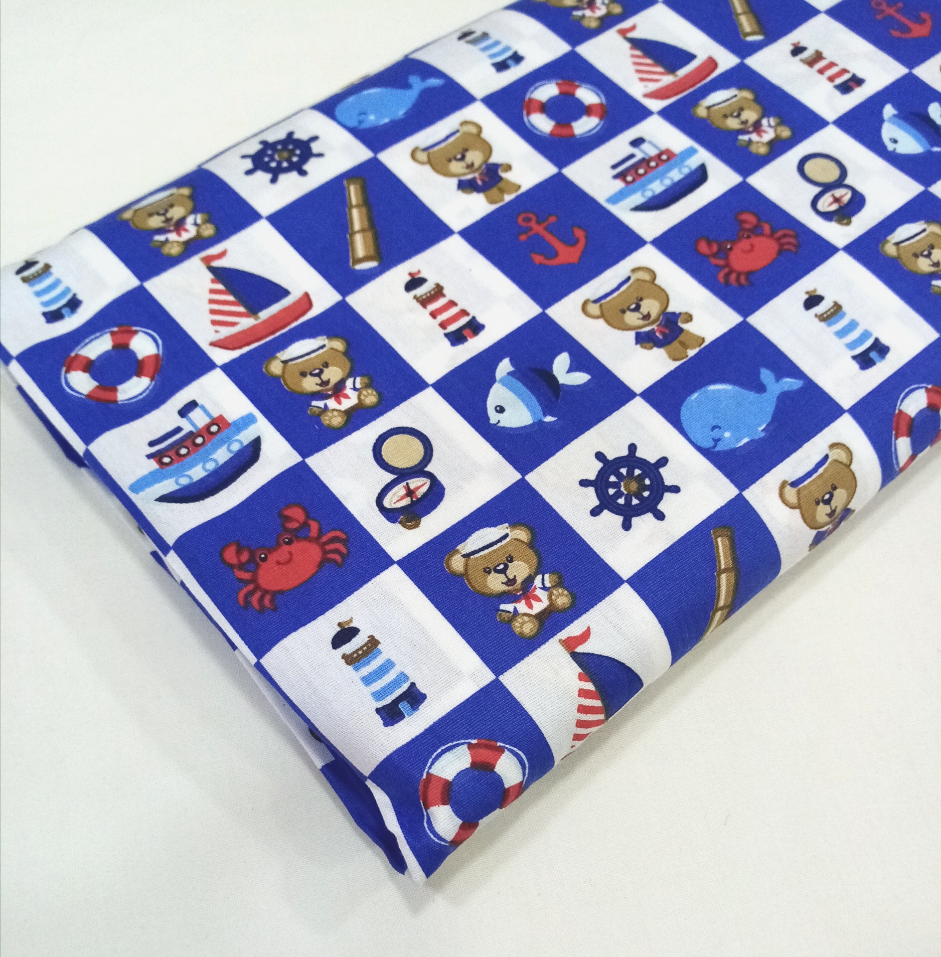 Tricoline Fabricart 100% algodão com ursinhos marinheiros em fundo quadriculado em azul e branco.