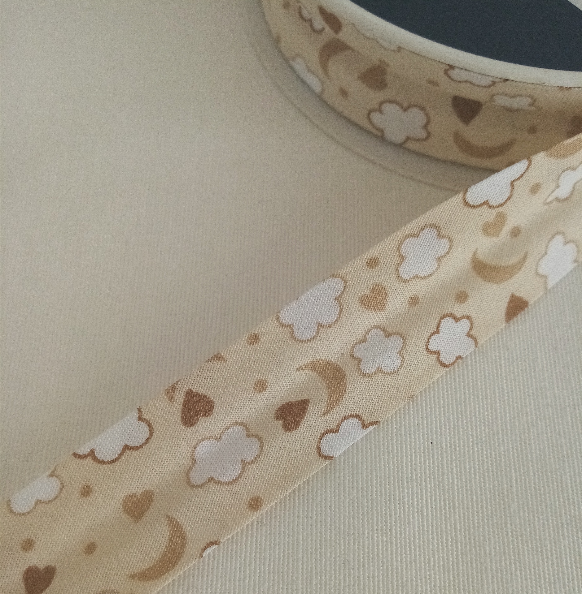 Viés com luas , corações e nuvens 0,01 € Partilhar Adicionar Contactar 1425 unidades em stock Fita de viés 100% algodão com luas, corações e nuvens em fundo creme . 25mm Ideal para remates e evitar bainhas Corte mínimo 20cm Tags Rematesbainhas