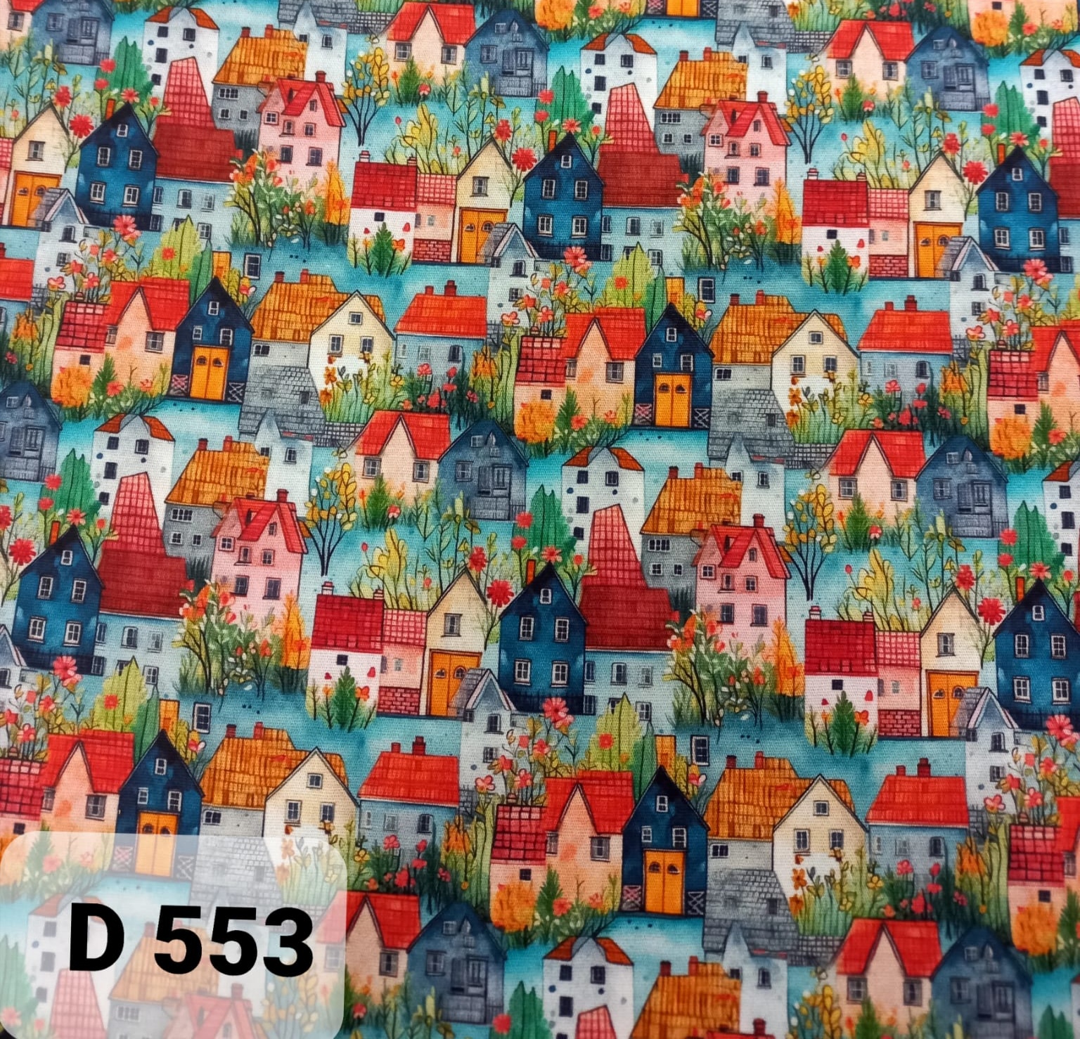 Tricoline Fabricart 100% algodão com casas no campo em fundo azul.