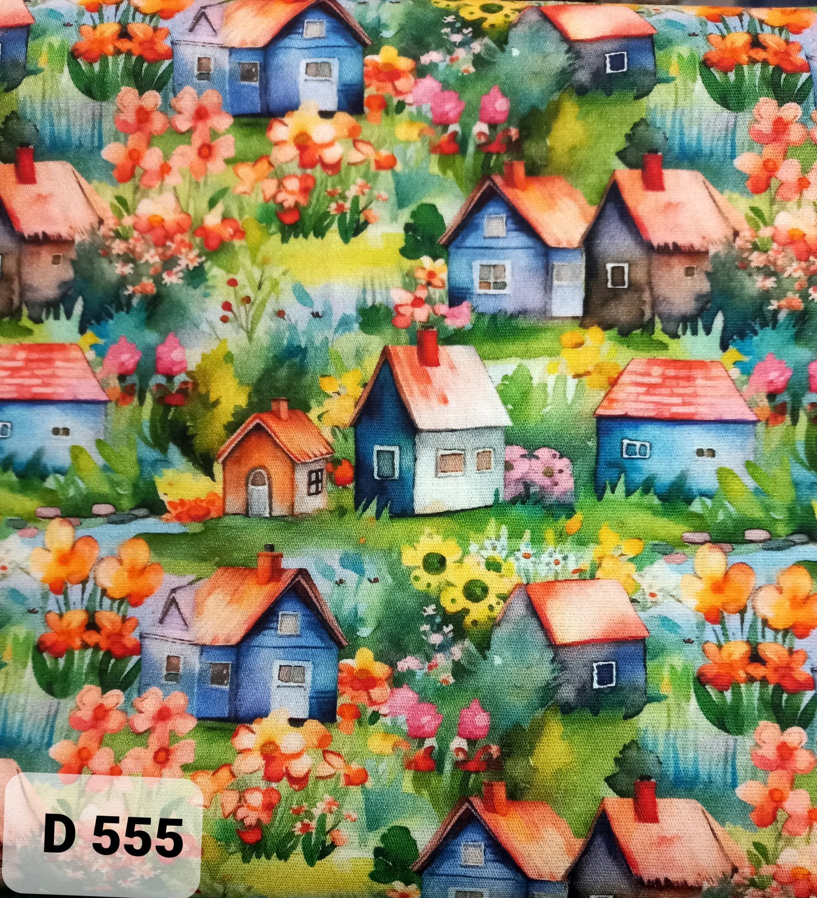 Tricoline Fabricart 100% algodão com casas no campo em fundo verde.