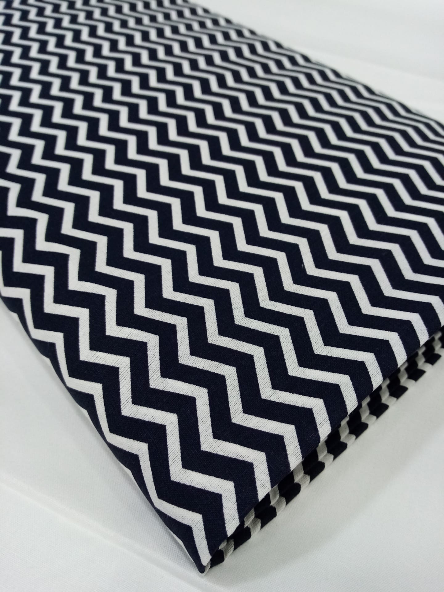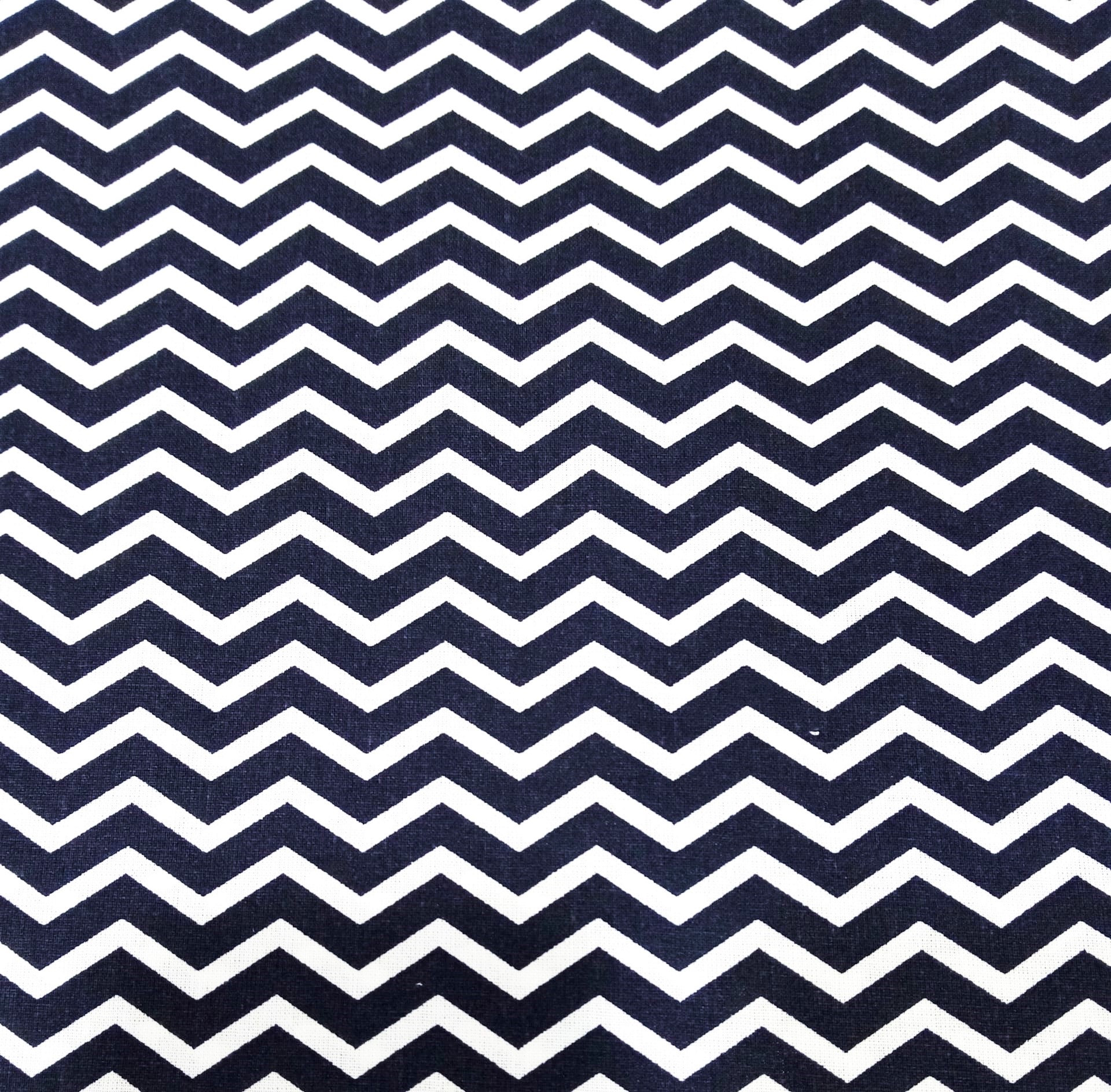 Popeline Domotex 100% algodão com um padrão de zig-zag em azul marinho e branco